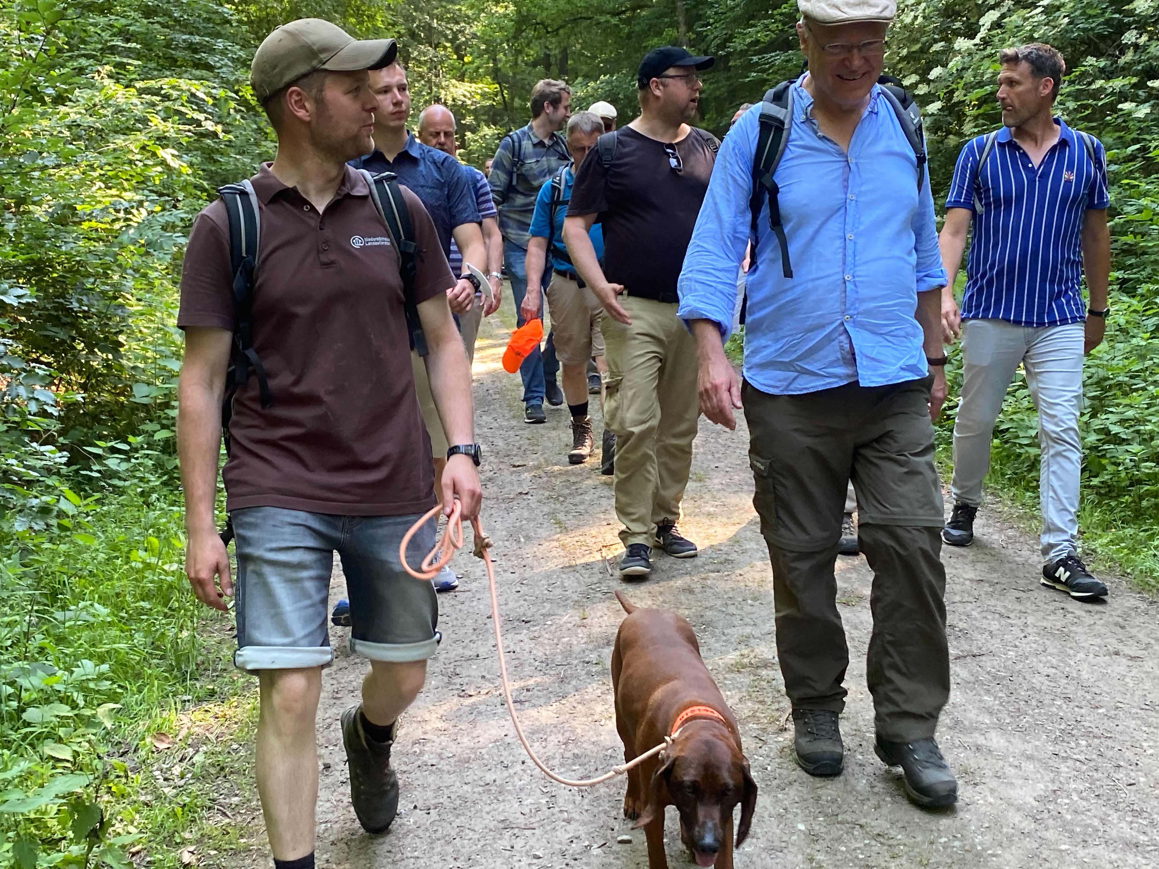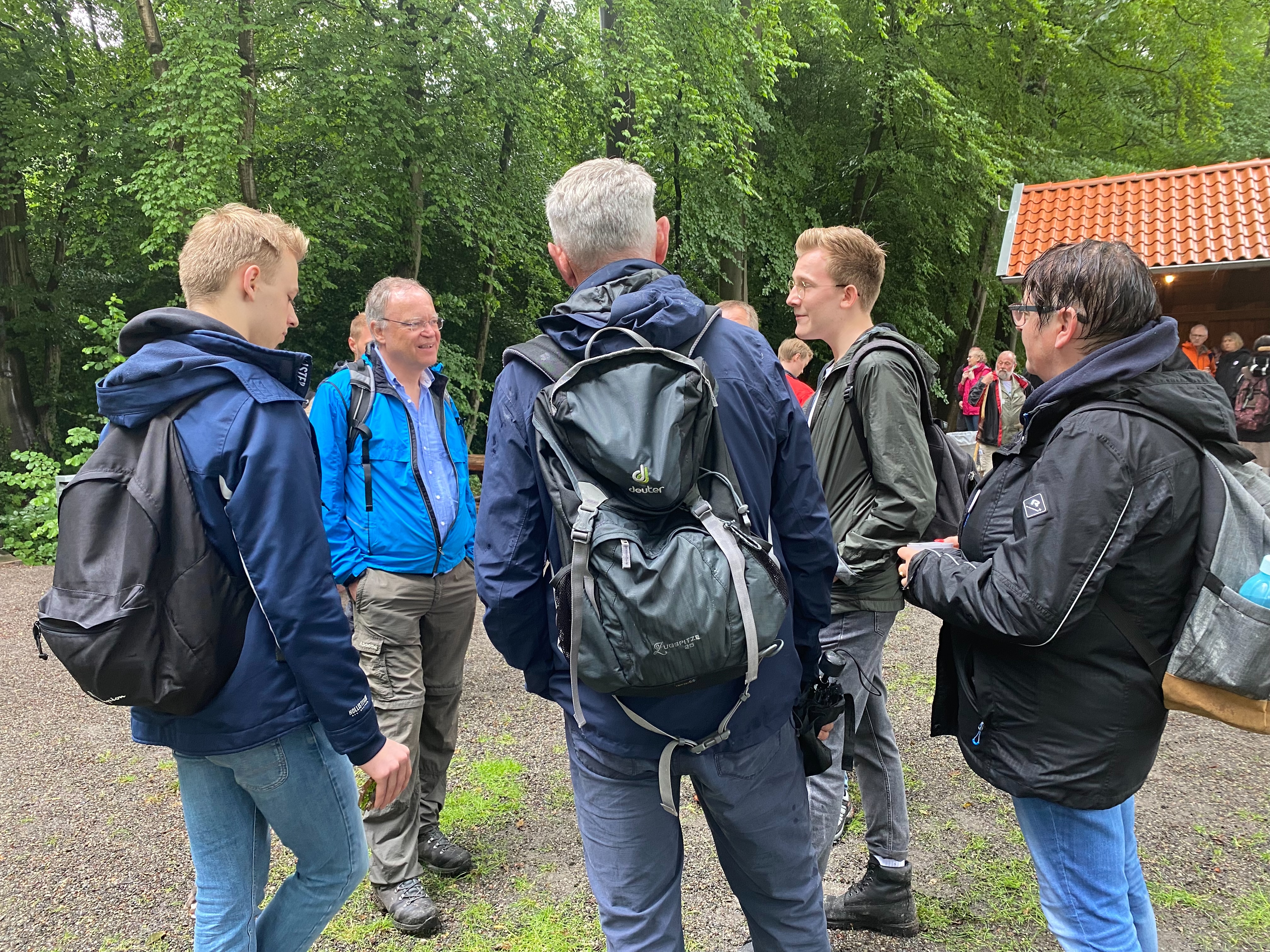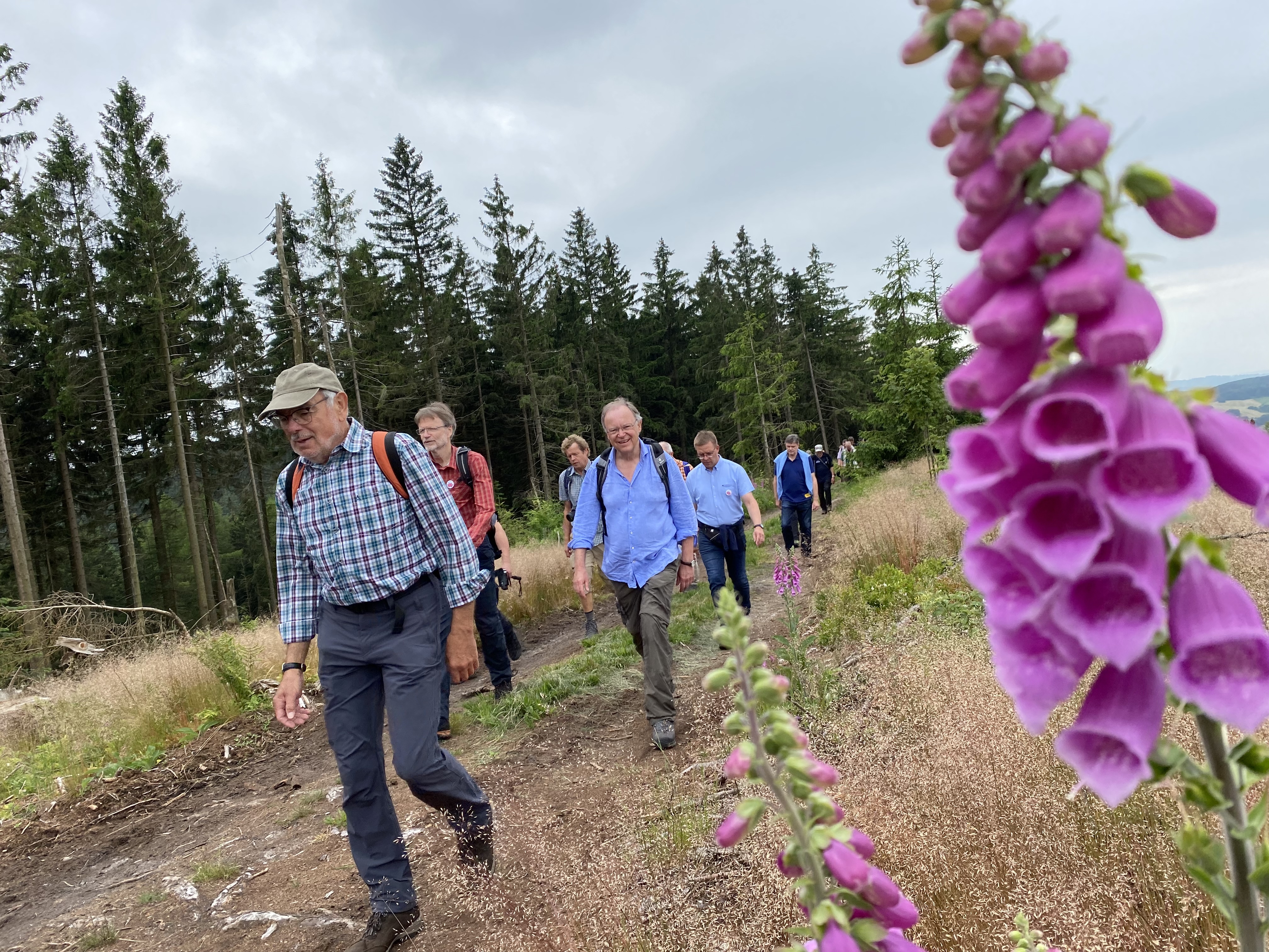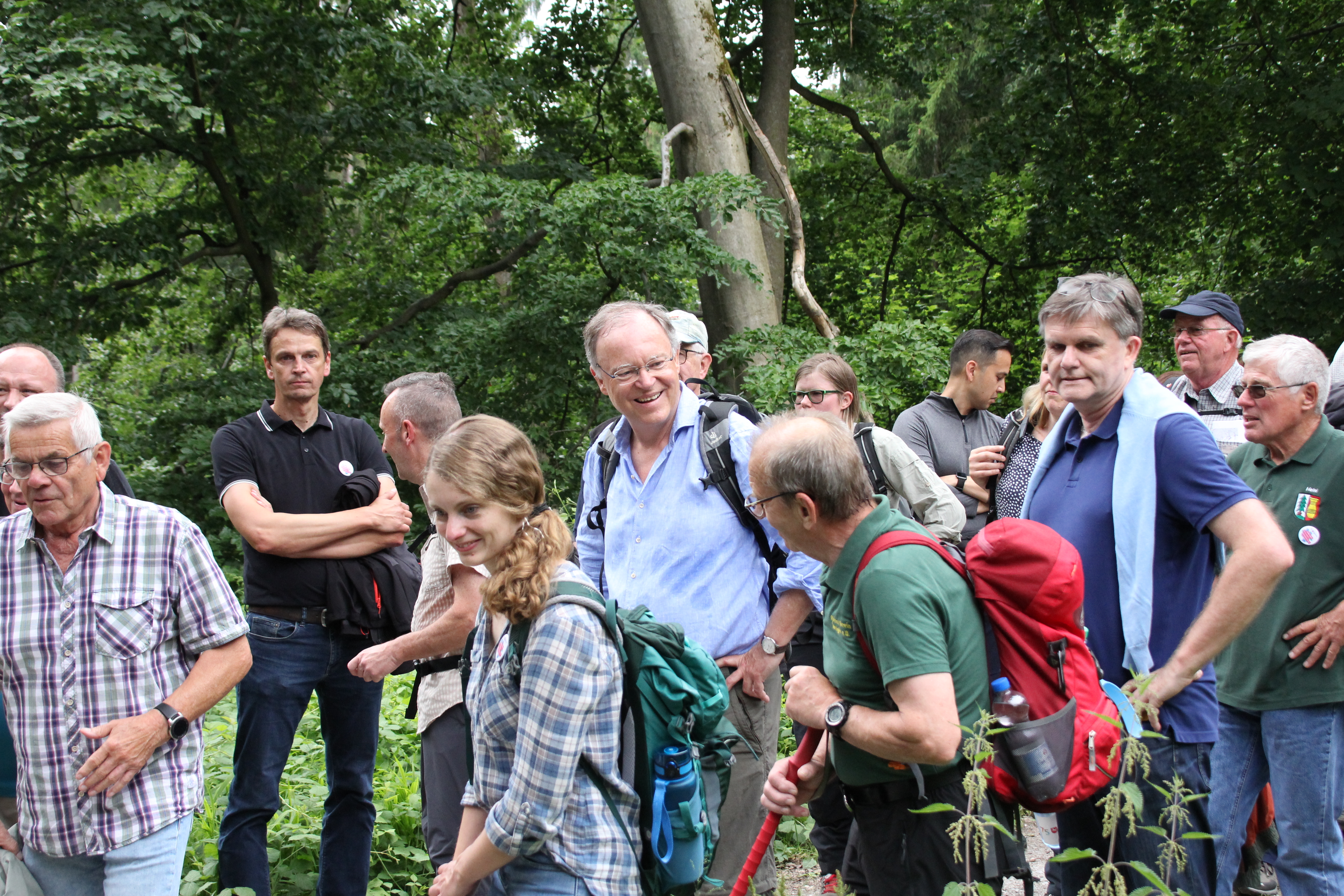 Ein Kontrastprogramm erwartete den Ministerpräsidenten bei der zweiten Wanderung: Auf dem Elm-Kreisel bei Schöningen im Landkreis Helmstedt führte der Weg durch Norddeutschlands größten Buchenwald. Die Schatten spendenden Bäume waren bei sommerlich heißen Temperaturen ein echter Segen für alle Wanderer*innen.