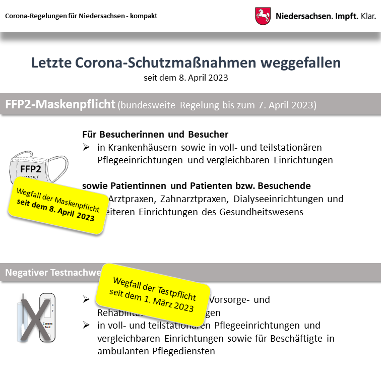Die bundesweite Maskenpflicht bei Besuchen in Heimen und Einrichtungen für ältere und pflegebedürftige Menschen sowie für Menschen mit Behinderungen, Krankenhäuser oder Arztpraxen ist am 8. April 2023 weggefallen.