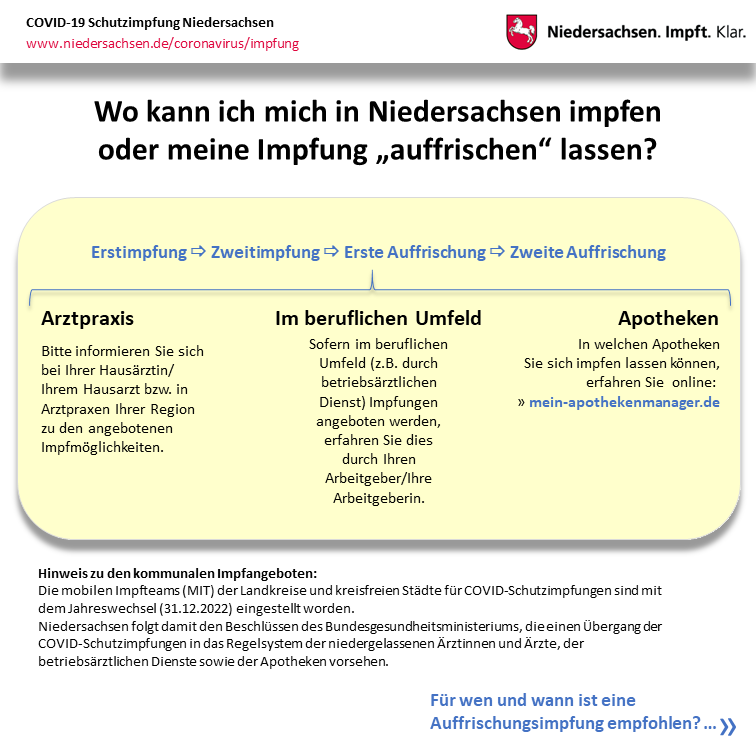 Die folgenden Seiten informieren Sie zum derzeitigen Infektionsgeschehen in Niedersachsen und rund um die weiter wichigen Schutzimpfungen sowie gibt einen Überblick zu den Hilfestellungen bei Long Covid.