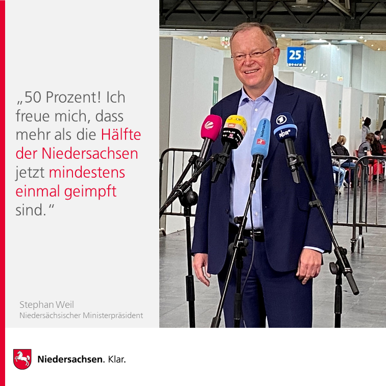 Erstes Etappenziel erreicht! Ich freue mich sehr darüber, dass jetzt mehr als die Hälfte der Bürgerinnen und Bürger in Niedersachsen mindestens einmal gegen das Coronavirus geimpft sind. Ärgerlich ist allerdings, dass der Bund im Juli voraussichtlich weniger Impfstoff nach Niedersachsen liefern wird als geplant. Nur mit mehr Impfstoff können wir dem berechtigten Wunsch vieler Bürgerinnen und Bürger nach einer Impfung nachkommen.