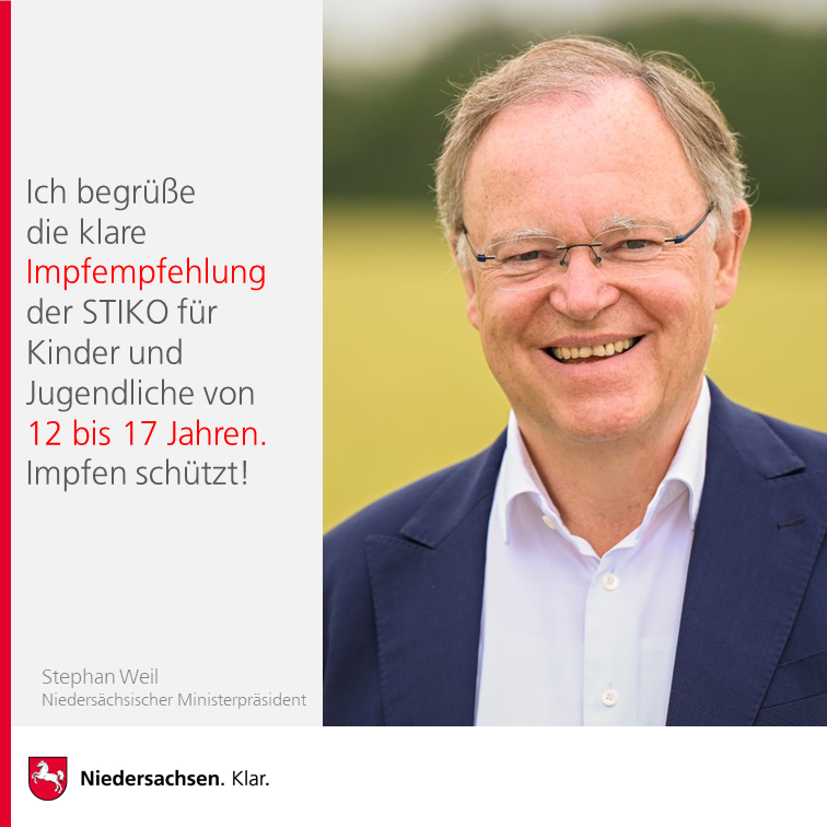 „Ich begrüße es sehr, dass die STIKO jetzt auch eine Corona-Schutzimpfung für Kinder und Jugendliche von 12 bis 17 Jahren ausdrücklich empfiehlt. Die klare Empfehlung der STIKO, dass der Nutzen der Impfung die Risiken überwiegt, dürfte vielen Eltern sowie den betroffenen Kindern und Jugendlichen die Entscheidung für eine Impfung deutlich erleichtern. Auf Basis der Zulassung durch die Europäische Arzneimittelbehörde bietet Niedersachsen bereits seit mehreren Wochen Impfungen ab 12 Jahren an. Mehr als 30 Prozent der 12- bis 17-Jährigen sind bereits mindestens einmal gegen COVID-19 geimpft – damit belegt Niedersachsen gemeinsam mit Schleswig-Holstein einen bundesweiten Spitzenplatz. Impfen ist und bleibt der bestmögliche Schutz gegen das Coronavirus, vor allem im Hinblick auf die mittlerweile dominierende hochansteckende Delta-Variante. Insofern freue ich mich darüber, dass die Impfungen in der Altersgruppe der 12- bis 17-Jährigen durch die STIKO-Empfehlung jetzt noch einmal zusätzlichen Schwung bekommen werden.“