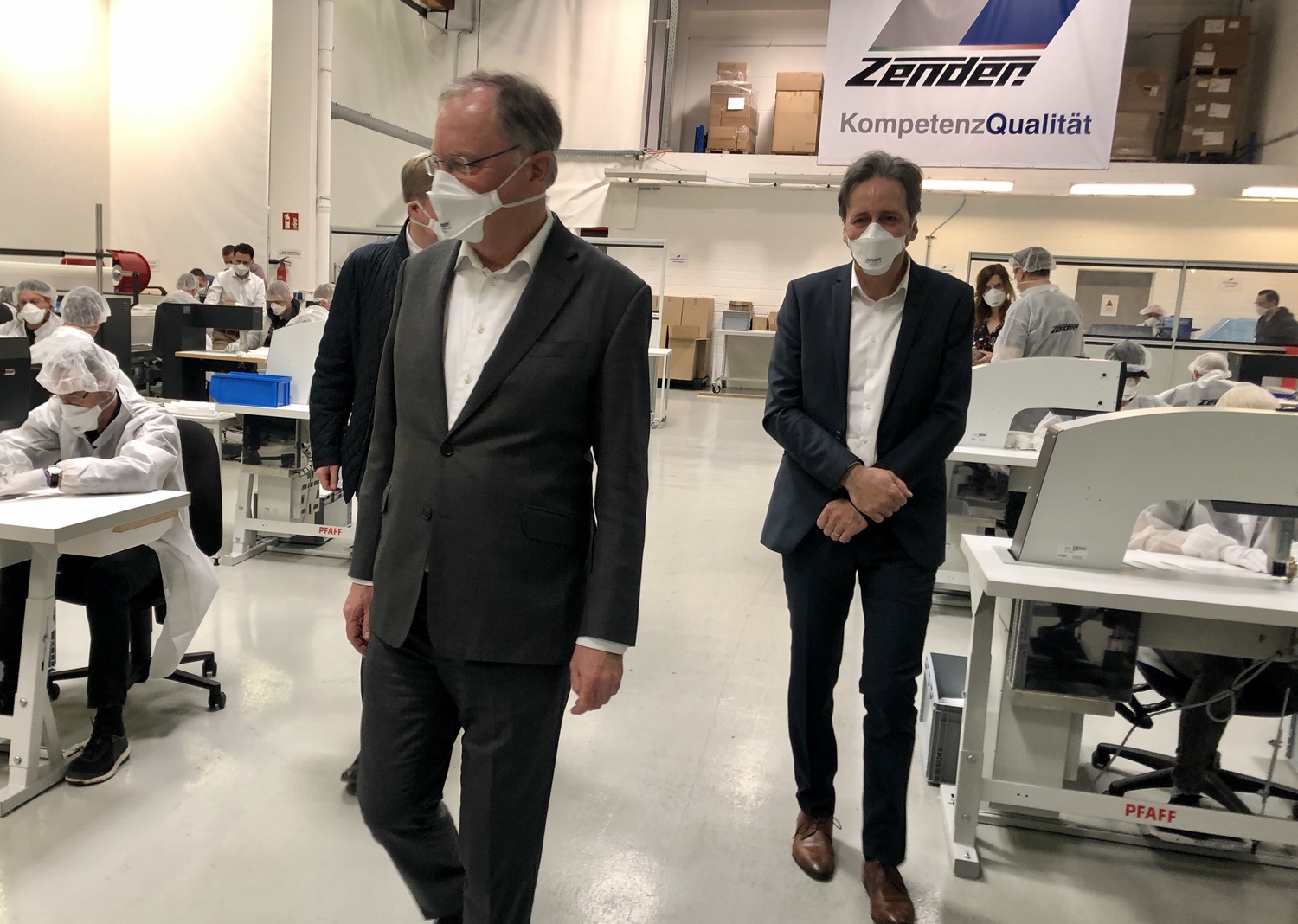 Ministerpräsident Stephan Weil hat am Mittag die Firma Zender in Osnabrück besucht. Der Automobilzulieferer hat seine Produktion innerhalb kurzer Zeit umgestellt, um jetzt FFP2-Masken herzustellen. „Diese Schutzmasken werden vor allem im Gesundheitswesen und der Pflege dringend benötigt“, so Ministerpräsident Weil. „Diese wirksamen Atemschutzmasken sind weltweit Mangelware, deshalb bin ich dem Unternehmen sehr dankbar, dass es mit 60.000 bis 100.000 Masken täglich einen großen Beitrag leistet, um die Versorgungslage zu verbessern.“ Weil zeigte sich hoch erfreut über diese bahnbrechende Innovationskraft eines niedersächsischen Unternehmens – „ein wunderbares Beispiel dafür, was in diesen Zeiten auch an positiven Dingen alles möglich ist!“