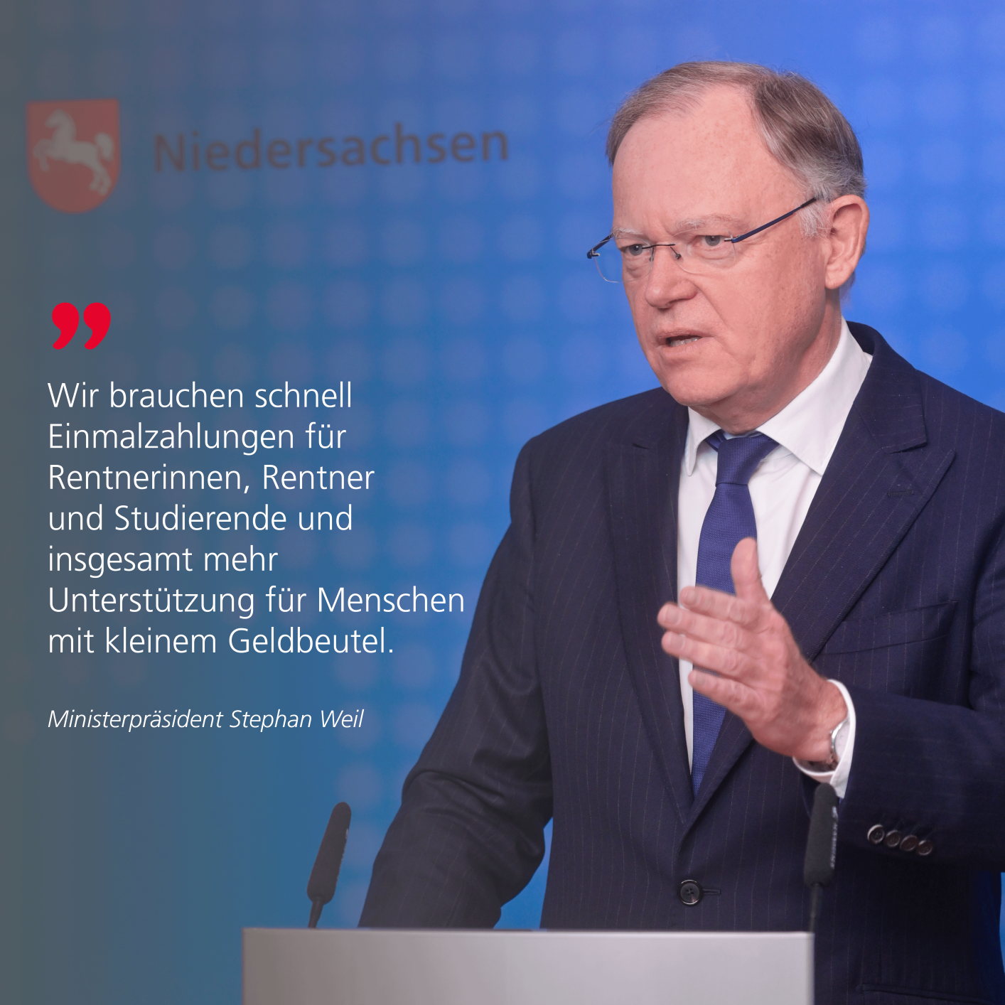 "Niedersachsen – Gemeinsam durch die Energiekrise. Dieser Schulterschluss von Land, Kommunen, Wirtschaft, Gewerkschaften, Kirchen, Energieversorgern und Sozialverbänden setzt ein starkes Zeichen. Wir wollen gemeinsam alles unternehmen, damit Energiekrise und Teuerungswelle nicht zur Zerreißprobe für die Gesellschaft in unserem Land werden. Die Landesregierung will noch in diesem Jahr zunächst bis zu 100 Millionen Euro bereitstellen, um insbesondere lokale Härtefallfonds zu unterstützen und die Energie- und Verbraucherberatung zu stärken. Menschen mit kleinem Geldbeutel müssen besonders unterstützt werden, dafür muss vor allem auch der Bund sorgen," so Ministerpräsident Stephan Weil im Anschluss an die Gesprächsrunde Soziale Problemlagen durch die Teuerungswelle Niedersachsen – Gemeinsam durch die Energiekrise.