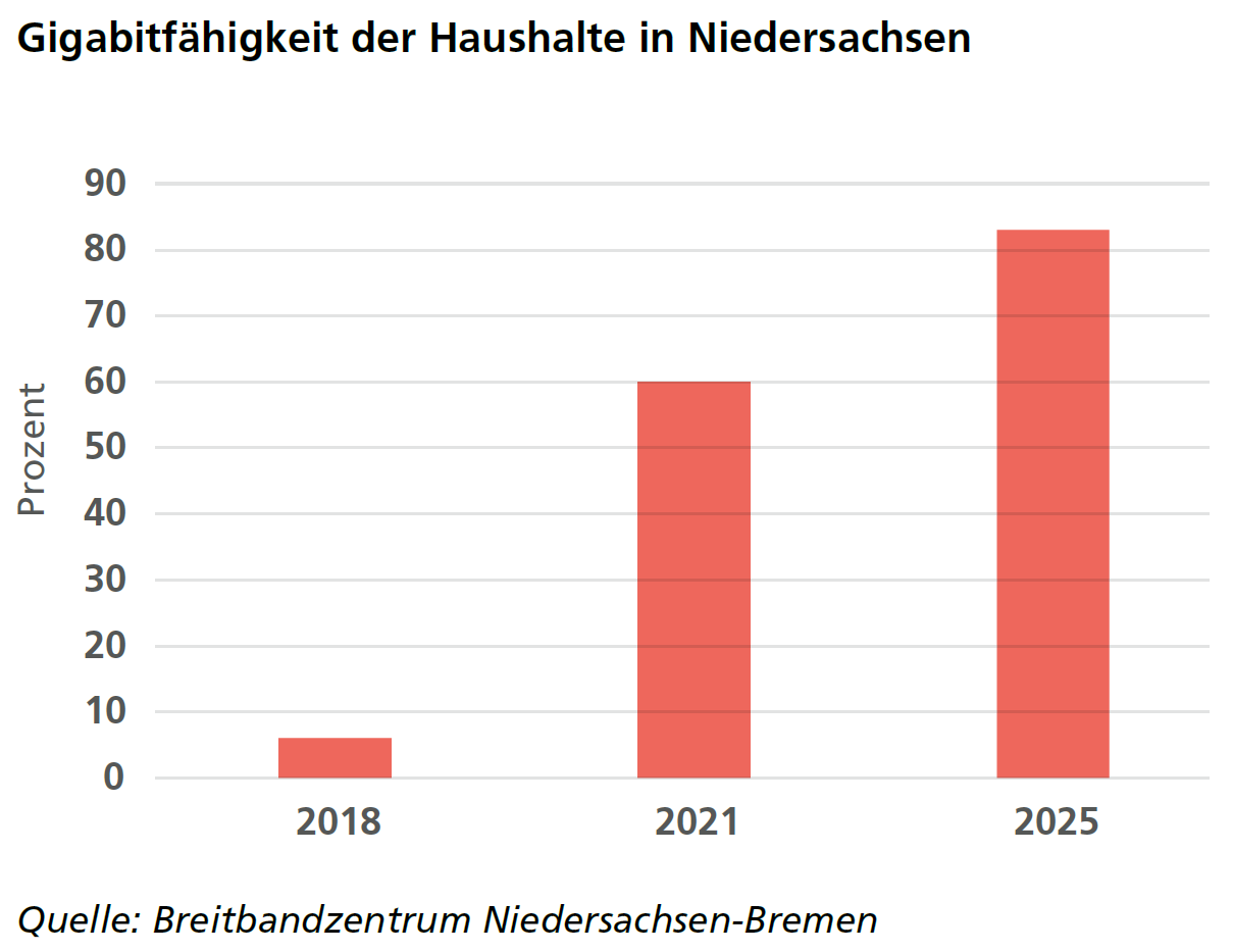 Damit liegt Niedersachsen bei der Versorgung auf Platz zwei unter den Flächenländern und nur noch zwei Prozentpunkte hinter dem Spitzenreiterland Schleswig-Holstein. Mit den bereits heute geplanten und im Bau befindlichen Ausbauprojekten wird sich die Zahl auf fast 80 Prozent erhöhen. Bei der Gigabitfähigkeit der Internetanschlüsse liegt Niedersachsen aktuell bereits bei 83 Prozent. 2018 lag dieser Wert erst bei sechs Prozent!