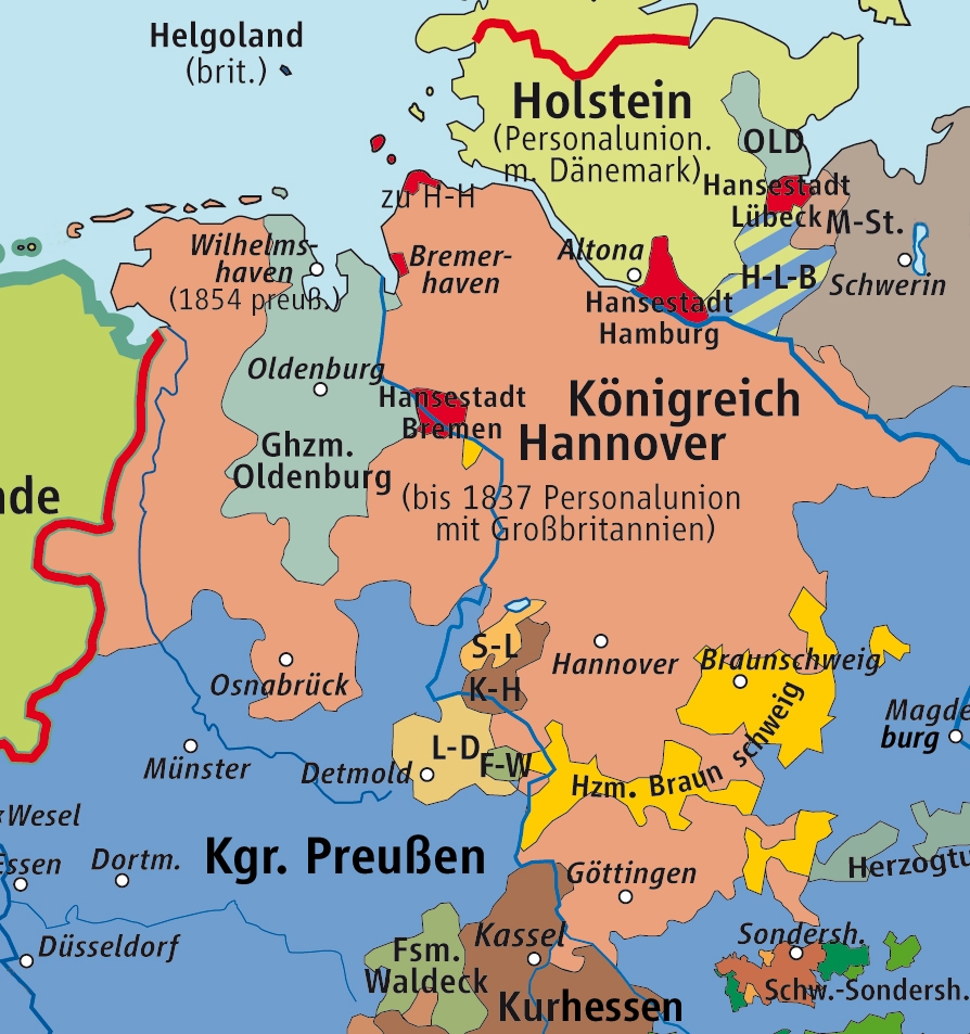 In der Zeit zwischen 1803 und 1806 besetzte Frankreich unter der Führung des berühmten Kaisers Napoleon viele deutsche Staaten. Als Napoleon 1815 besiegt wurde, beschlossen die deutschen Länder ihre Macht neu zu verteilen. Das Königreich Hannover wurde jetzt ein Teil des „Deutschen Bundes“. Das war ein Bündnis vieler kleiner deutscher Staaten. Neben dem Königreich Hannover, das seit dem 18. Jahrhundert durch die Personalunion eng mit dem Vereinigten Königreich Großbritannien und Nordirland verbunden waren, bestanden auf dem Gebiet des heutigen Niedersachsen drei weitere kleine Staaten: das Großherzogtum Oldenburg, das Herzogtum Braunschweig und das Fürstentum Schaumburg-Lippe.