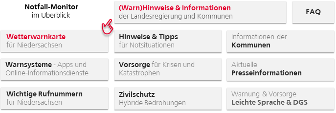 Wir aktualisieren fortlaufend die Presseinformationen rund um die Themen des Notfall-Monitors - von Einsätzen der niedersächsischen Löschflugzeuge über Maßnahmen zum Hochwasserschutz bis hin zu Neuigkeiten im Bevölkerungsschutz. mehrWarnung und Vorsorge sind das Fundament für einen starken Bevölkerungsschutz. In unserem Notfall-Monitor haben wir für Sie die wichtigsten Elemente zusammengestellt.