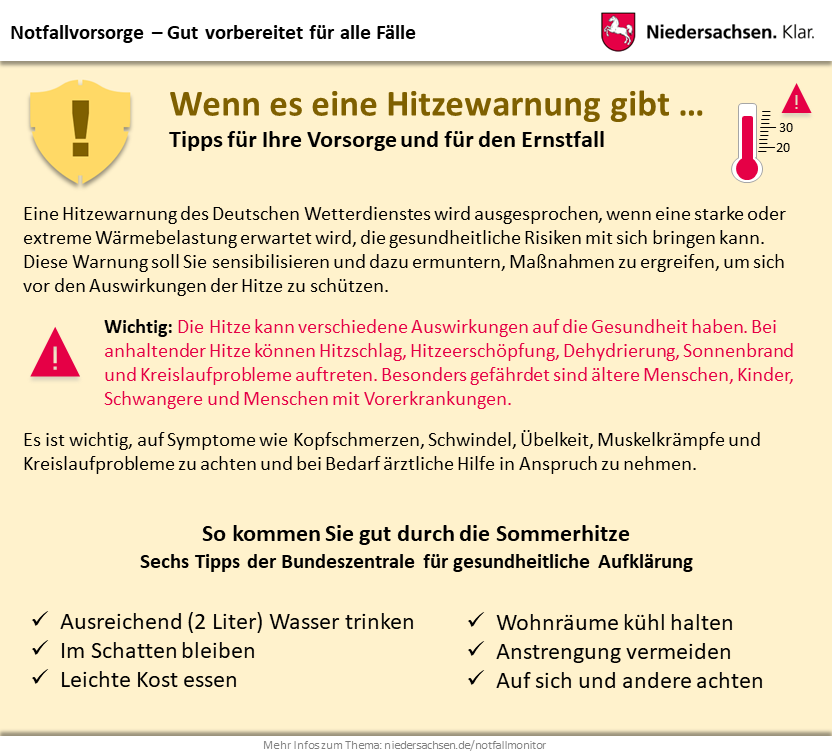 Eine Hitzewarnung des Deutschen Wetterdienstes wird für Niedersachsen und einzelne Landkreise ausgesprochen, wenn eine starke oder extreme Wärmebelastung erwartet wird, die gesundheitliche Risiken mit sich bringen kann. Diese Warnung soll die Bevölkerung sensibilisieren und dazu anhalten, Maßnahmen zu ergreifen, um sich vor den Auswirkungen der Hitze zu schützen.