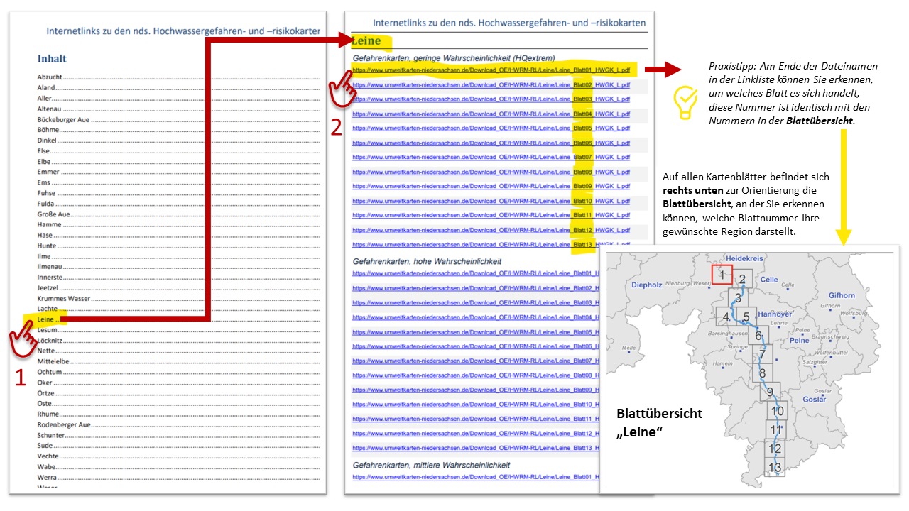 Auswahl der Karte: Aufgrund der Detailtiefe der Karten werden die jeweiligen Flussgebiete in einzelne Kartenabschnitte unterteilt, d.h. je nach Flusslänge können auch mal mehr als 10 Kartenblätter (in Küstengebieten auch über 20 Blätter) angeboten werden. Sie finden also je nach Szenario eine Liste mit Links zu den einzelnen Kartenabschnitten, diese sind an der Blattnummer am Ende des Link-Textes erkennbar.