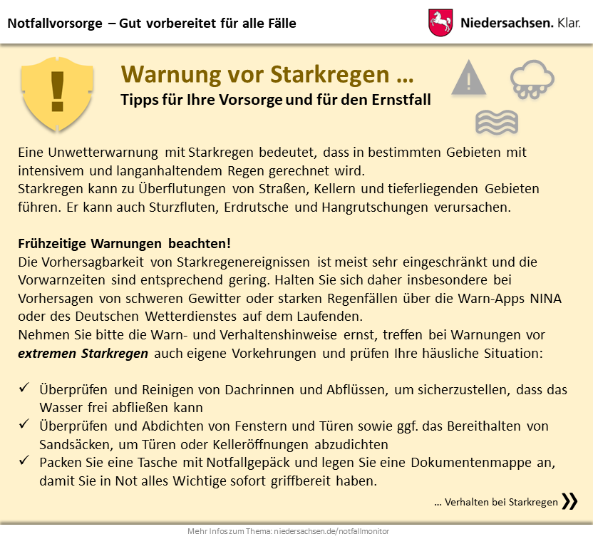 Nehmen Sie bitte die Warn- und Verhaltenshinweise ernst, treffen bei Warnungen vor extremen Starkregen auch eigene Vorkehrungen und prüfen Ihre häusliche Situation: