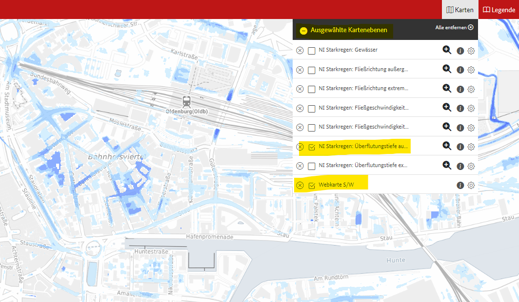 Hier sehen Sie die möglichen Überschwemmungen im Bahnhofsviertel der Stadt Oldenburg bei einem 'außergewöhnlichen Ereignis' = Haken bei NI Starkregen: Überflutungstiefe au…