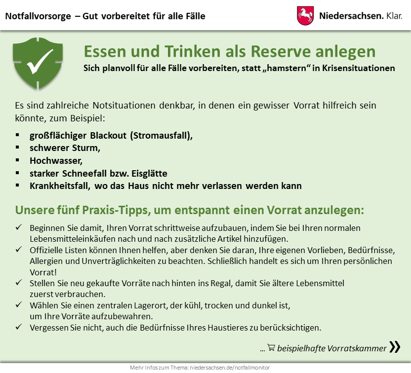 Was der Staat im Falle von Versorgungsengpässen unternimmt, und wie Sie selbst durch eine eigene private Vorratshaltung vorsorgen können, erfahren Sie ebenfalls auf der gemeinsamen Seite des Bundes und der Länder: » www.ernaehrungsvorsorge.de.