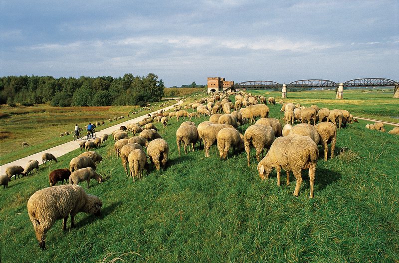 Schafherde auf Deich nahe der Alten Elbbrücke bei Damnatz