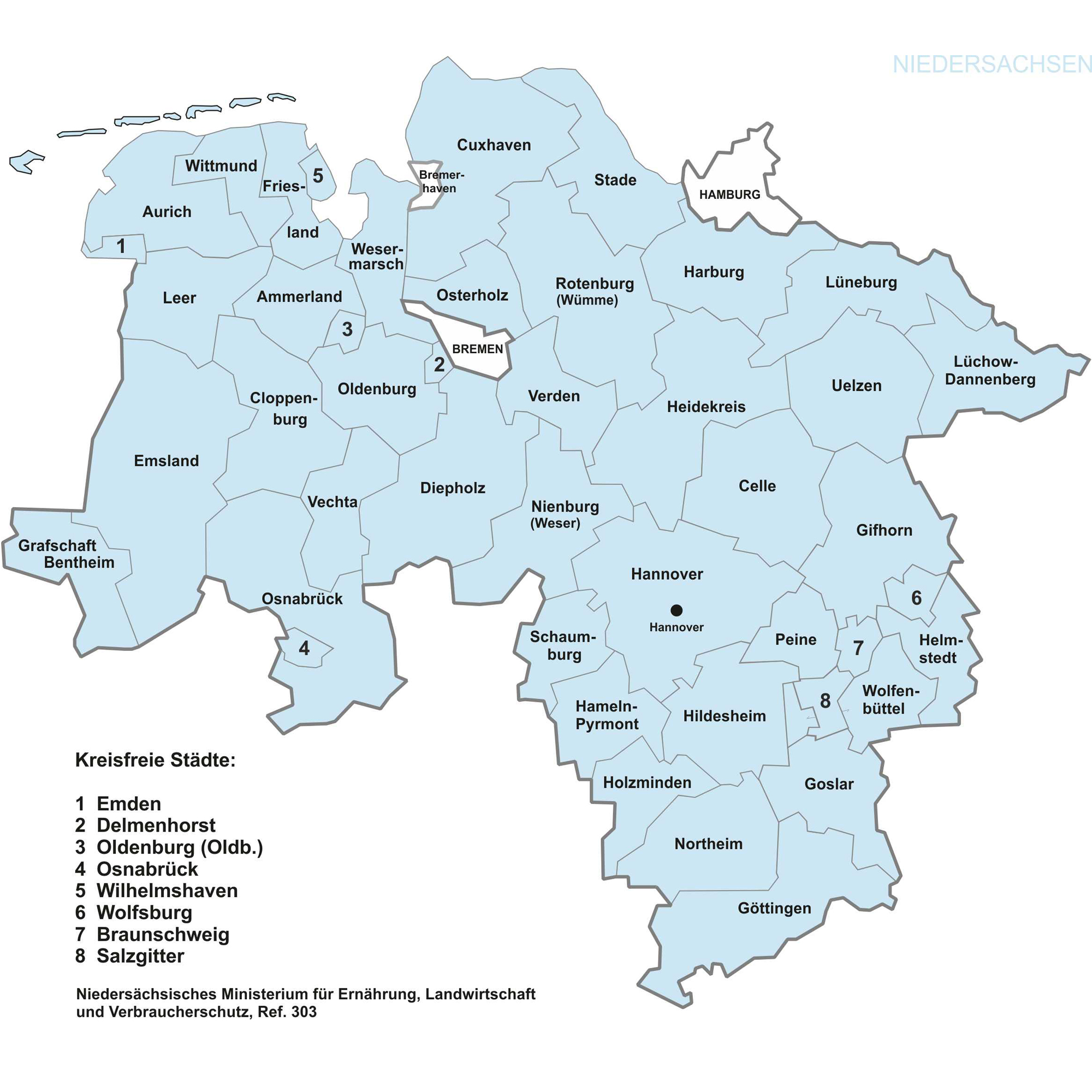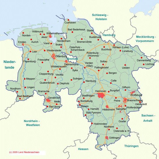 Die im folgenden dargestellten Karten können Sie gern mit den Hinweis "Quelle: www.niedersachsen.de" für eigene Publikationen verwenden.