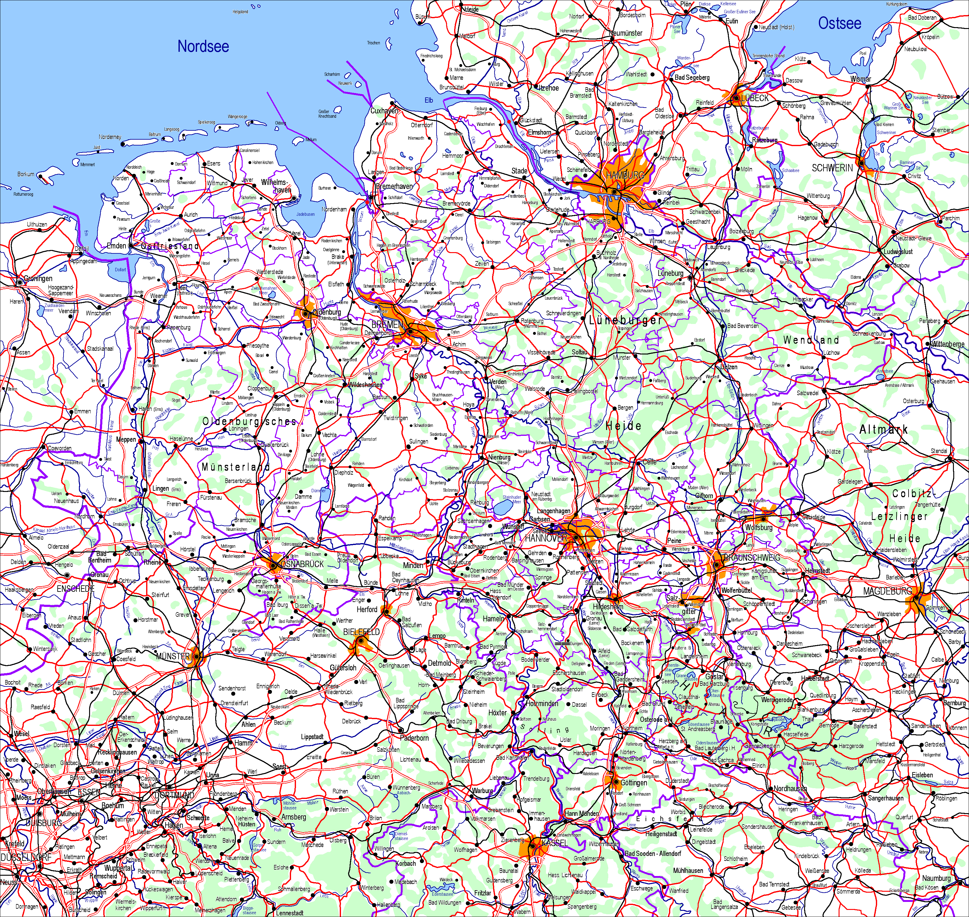 Gesamtübersichtskarte mit Kreisgrenzen und Straßennetz