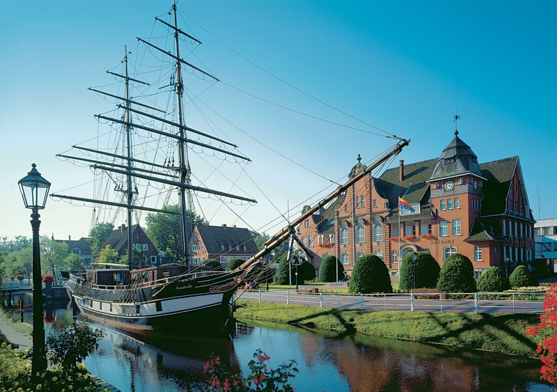 Papenburg: Segelschiff vor Rathaus
