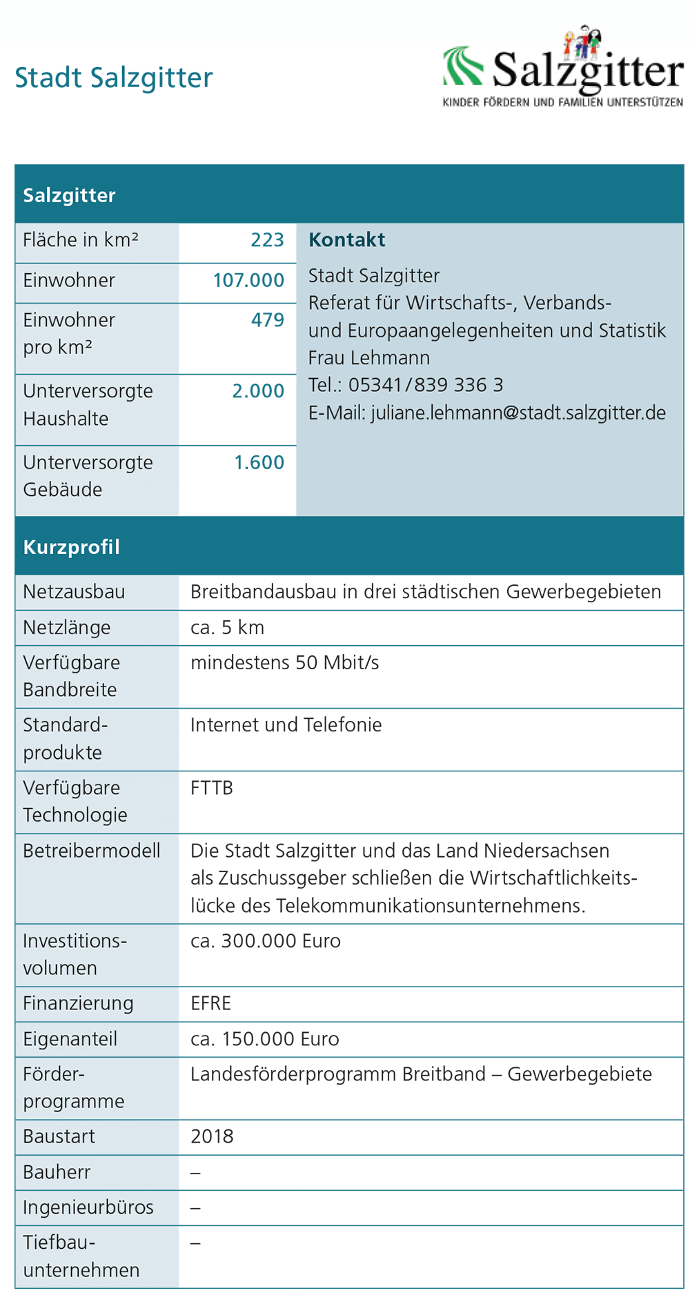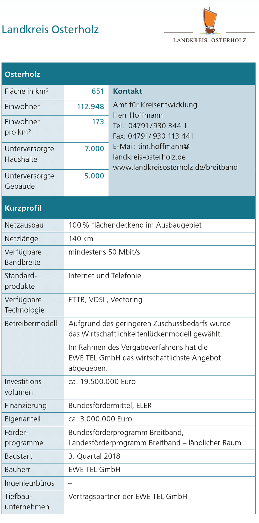 In Niedersachsen arbeiten 15 Landkreise und kreisfreie Städte im Betreiber- und 27 Landkreise und kreisfreie Städte im Wirtschaftlichkeitslückenmodell. In vielen dieser Kommunen erfolgte bereits von Ende 2017 bis zum Frühjahr 2018 der erste Spatenstich für den geförderten Breitbandausbau.Einige geförderte Projekte setzen ausschließlich auf den FttB-Ausbau. Bei anderen Projekten erfolgt ein kombinierter FttC-/FttB-Ausbau. Hierbei stellt der FttC-Ausbau einen Zwischenschritt zum Glasfaserdirektanschluss dar.